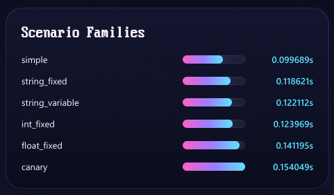 I'm particularly proud of the architecture of this benchmark. I hand designed the Models to simulate several types of data. Canary in particular handles every type of field my framework supports. But then I also have fixed ints, variable strings, and fixed strings, among other benchmarks you can run. Every type shows a clear and distinct performance profile among the various frameworks.