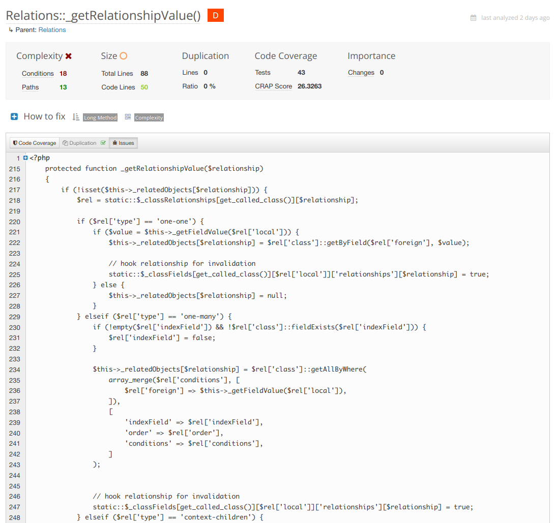 In this case the refactor is obvious. Break up each of the relationship types into smaller method calls inside the same class. Each one responsible for only it's own thing. Complexity drops. Your tests become far simpler and targeted.
